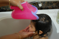 Comfortable grip makes it easier to hold, and a deep, slender base can be used for easy filling in shallow water. It has a unique tear-free edge that is soft, rubber like and contoured so that it can be gently placed against your baby's skin to help prevent water from running into their eyes. After using it for a few days, I found that it works the best, if we elevate baby's head a little bit, so that water goes at the back while rinsing hair rather than on baby's face. Try lifting little bit more than as shown in above picture.